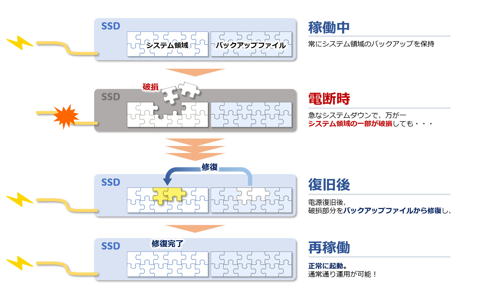 システム管理領域を二重化構造とした安心設計。 電断時の急なシステムダウン(メンテナンス時の主電源断、停電、落雷等)による故障を未然に防止。 電源復旧後には正常に起動することができます。 ※ 電断対策には、OSのライトフィルタ機能との併用が必要になります。