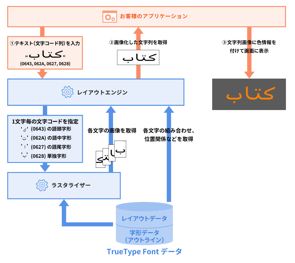 アラビア語ではテキストを書き進める方向(書字方向)が右から左です。また、同じ文字でも文中や単語中の位置によってその字形が変化します。 タイ語では子音文字の上下左右に母音文字や声調記号が配置されます。 レイアウトエンジンは、このような複雑な表記ルールの処理に従って各文字画像をレイアウトし、正しい文字列画像を生成します。