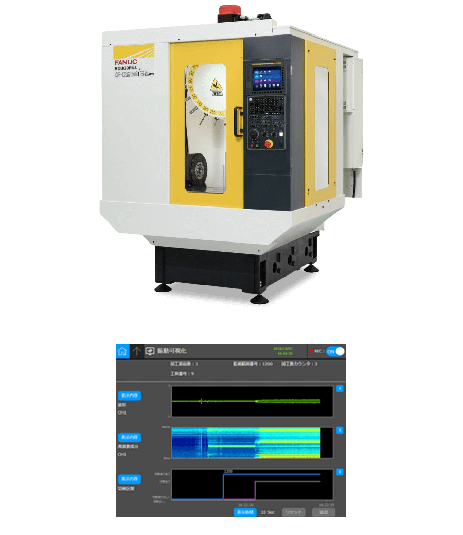 ファナック製のマシニングセンタ「ロボドリル」をはじめとしたファナック製CNC採用のマシニングセンタに取付可能※。振動センサーは主軸側面などに設置します。ロボドリルに取り付けた場合は、ロボドリルのメニュー画面上で振動の波形やFFT(Fast Fourier Transform)解析による周波数成分(スペクトログラム)、切削区間の表示が可能です。