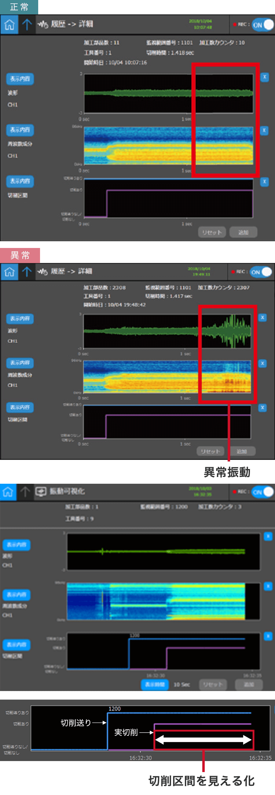 振動データは切削区間ごとに自動的に可視化・整理されて保存されるので、異常発生時の振動データの振り返りが容易