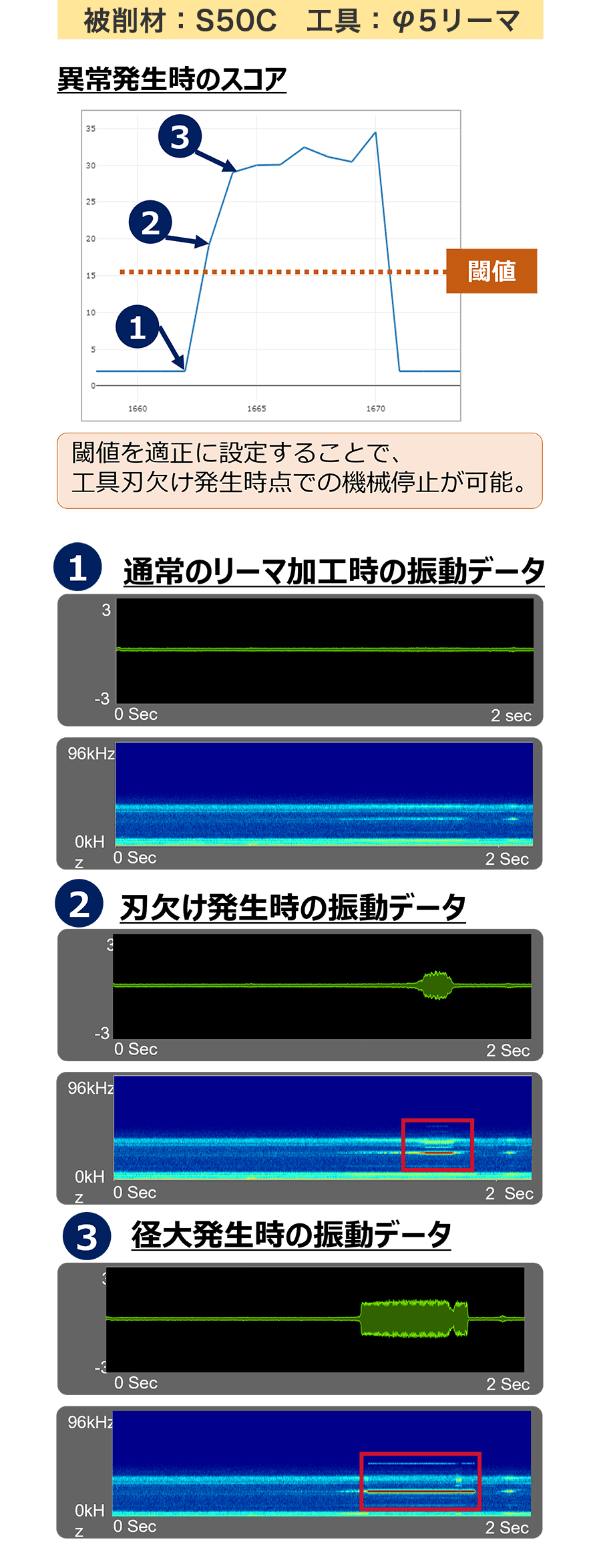 正常加工の振動データを10回程度、AIで機械学習。モニタリングしたい異常(摩耗、チッピング、折損、偏心、主軸異常など)ごとに開発したリコー独自のAI解析モデルで振動データを自動でスコア化。一定のスコア(閾値)を超えたら異常アラートを出力したり、マシンを停止するように設定可能です。異常の有無にかかわらず定期的に切削工具を交換する「TBM」から、異常の予兆を察知して切削工具を交換する「CBM」を実現します。