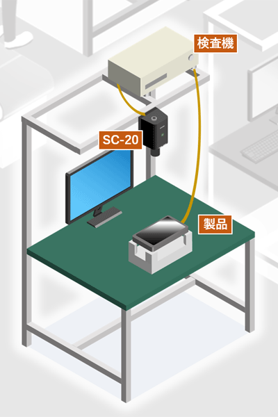目視での検査を廃止し、検査漏れによる不良品の流出を防止するため、SC-20を導入し、以下のように既存の検査機との連携する検査システムを構築した。