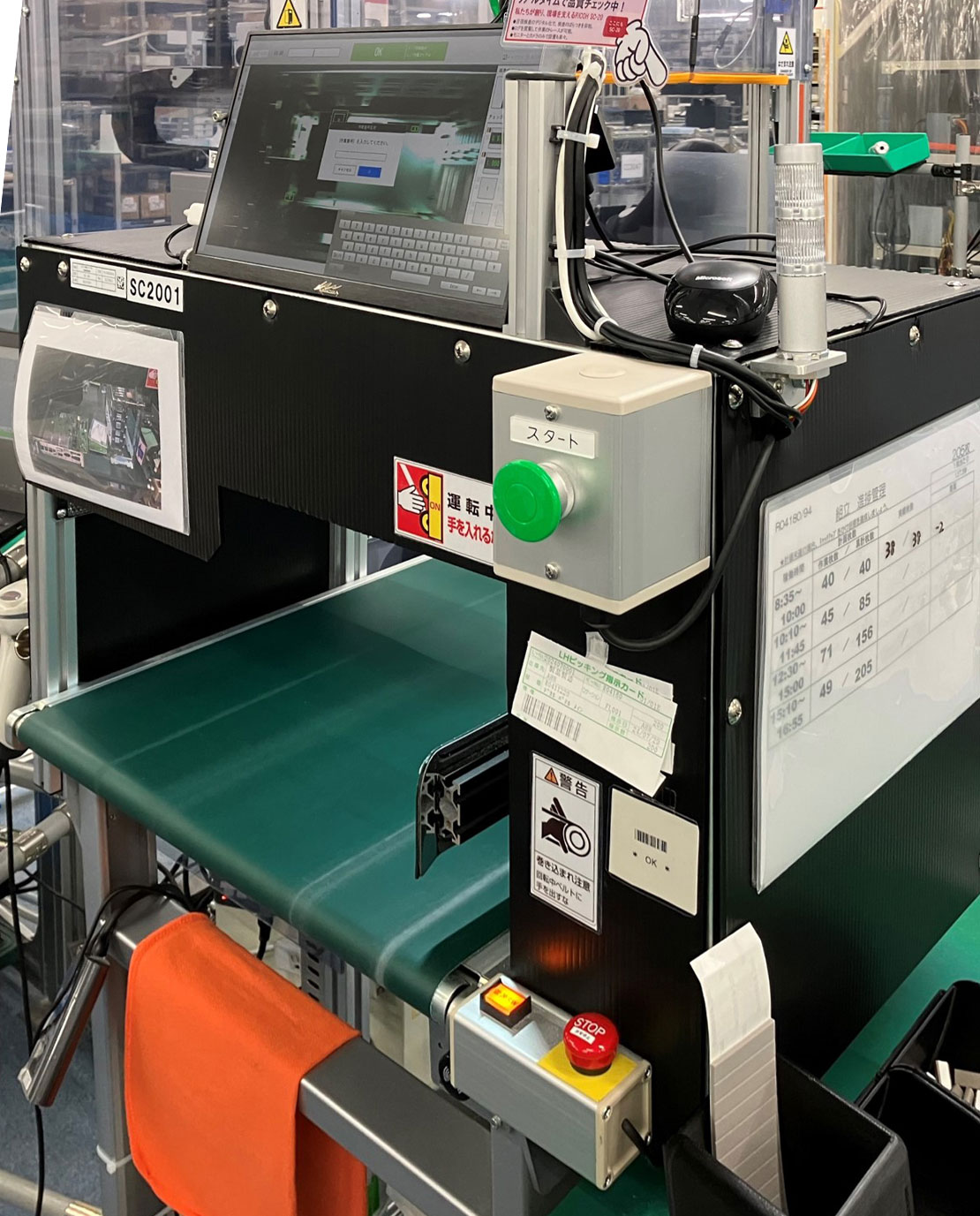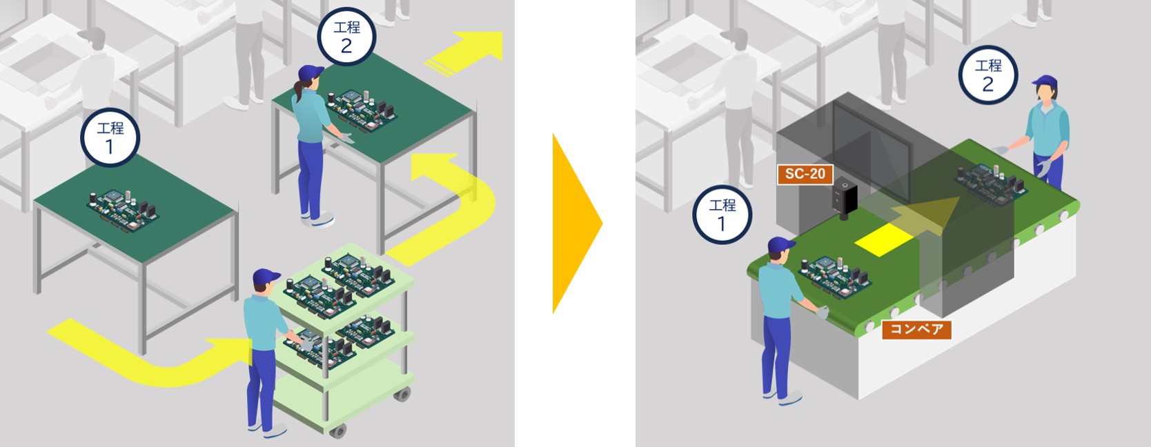次工程への製品の搬送をSC-20の検査と連携し、タクトタイムの短縮と工数の削減に成功した事例。 SC-20の判定をトリガーにコンベアを動作させ、次工程の作業台へ自動で移動するため台車での移送が不要に。 目視検査を自動化するだけでなく作業員の無駄な歩行動作を削減した、工場設備との組み合わせによる活用例です。