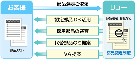 リコーグループの部品選定・購買システムを駆使し、ワールドワイドでQCD最適な電子部品を選定・調達します。大量購入メリットを活かした安価な価格設定を可能とするとともに、生産中止情報などを把握するネットワークシステムがあります。レイアウト設計後はこのシステムの情報に基づき国内・中国の認定メーカー十数社よりPWBなどの電子部品を調達します。