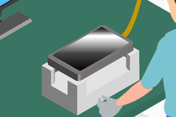 - 製品を固定治具にセットし、SC-20の検査をスタートすると検査機から検査プログラムが実行され、製品の画面に既定の文字列が表示されるように連携